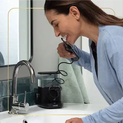 - The unique combination of water pressure and pulsations cleans deep between the teeth and below the gumline.