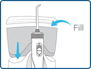 - Fill the water flosser reservoir with lukewarm water and place it firmly on the base.