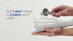 - Add 1-part white vinegar to 2 parts warm water to the reservoir and run the mixture through your water flosser.